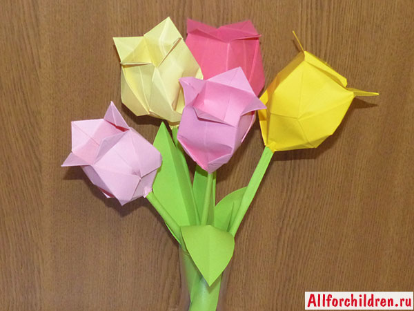 Шаг 16. Лист тюльпана делаем из прямоугольного удлиненного зеленого листа бумаги. Сначала складываем его вдоль пополам, а затем загибаем уголки на концах.