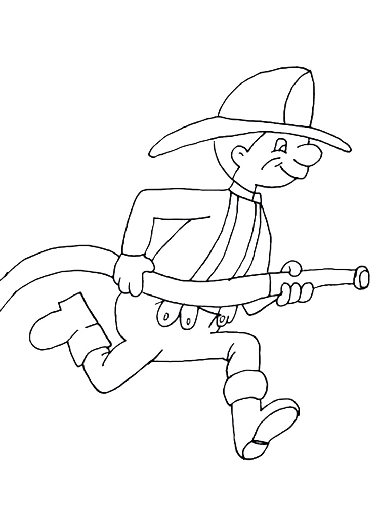 ГлавнаяЮный художникРаскраскиПрофессииПожарные → Пожарный с рукавом бежит тушить пожар