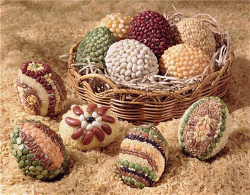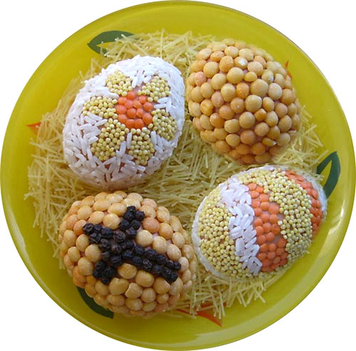 Яйца можно украсить как одним видом крупы, так и выкладывать узоры из разных видов круп.