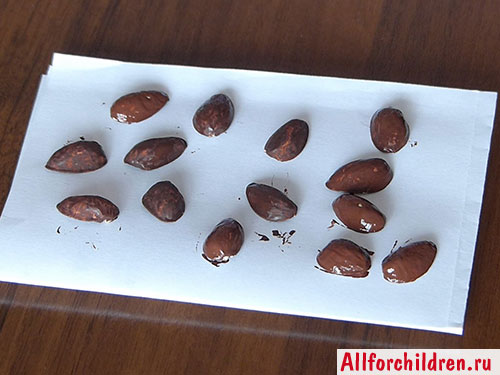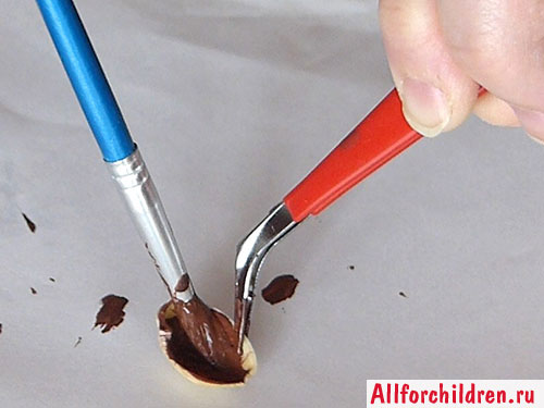2. Соберите скорлупки фисташковых орехов. На одну веточку понадобится 4-5 скорлупок. Хорошенько их промойте, ведь обычно фисташки продают подсоленными. Высушите скорлупки и покрасьте коричневой краской с обеих сторон.