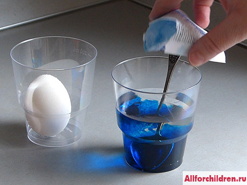 1. Краситель приготовьте, как обычно: можно использовать самодельные (из луковой шелухи, свеклы, шпината и .т д.) или купленные в магазине. Возьмите стаканчик: он должен быть достаточно узким, чтобы яйцо в нем стояло вертикально или почти вертикально.