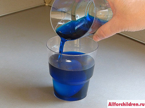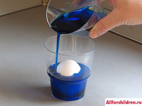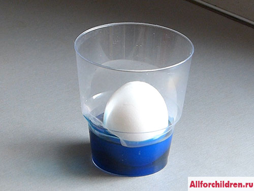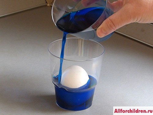 2. Налейте в стаканчик с яйцом столько раствора красителя, чтобы он покрыл яйцо на четверть. Лейте краситель аккуратно, вдоль стенки стакана, чтобы он не попал на ту часть, которая не покрыта раствором.