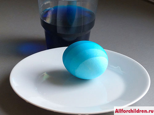 3. Подержите яйцо в растворе красителя некоторое время - от 30 до 60 секунд, возможно больше (зависит от красителя, экспериментируйте!) Затем долейте красителя, чтобы он покрыл яйцо наполовину и снова подержите секунд 30-60.