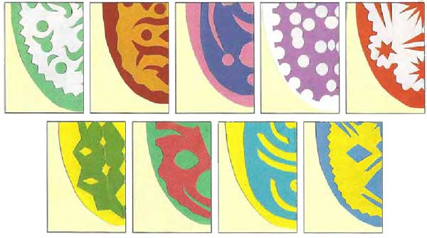 1. Прямоугольник бумаги сложи вчетверо и вырежи четверть (1/4) овала, потом вырежи дырочки, полоски и другие узоры.