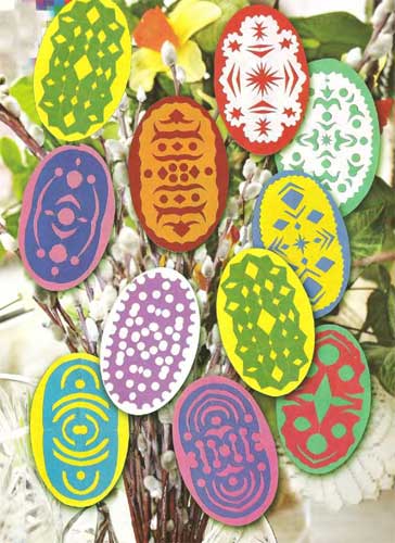 Чтобы не тратить много времени на настоящую писанку, ты можешь украсить букет вербы и открытку ажурными пасхальными яйцами, вырезанными из бумаги, - вытынанками.