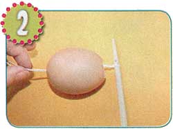 Сквозь скорлупу продень толстую натуральную нить. Конец нити со стороны маленькой дырочки закрепи пластилином, а конец с другой стороны намотай на зубочистку.