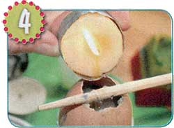 Растопи воск на водяной бане и аккуратно залей его в скорлупу. Если нет воска, растопи свечу. Обязательно попроси взрослых помочь тебе.