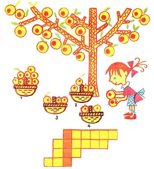 Сосчитайте яблоки в корзинах, впишите буквами количество яблок в клетки. И тогда вы узнаете, как зовут девочку.