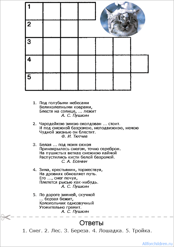 Слова этого кроссворда загаданы в отрывках стихотворений русских поэтов о зиме. Вспомни эти стихи или угадай по смыслу, какие слова пропущены.