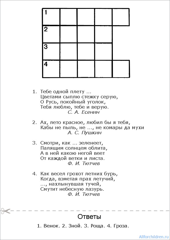 Слова этого кроссворда загаданы в отрывках стихотворений русских поэтов о лете. Вспомни эти стихи или угадай по смыслу, какие слова пропущены.