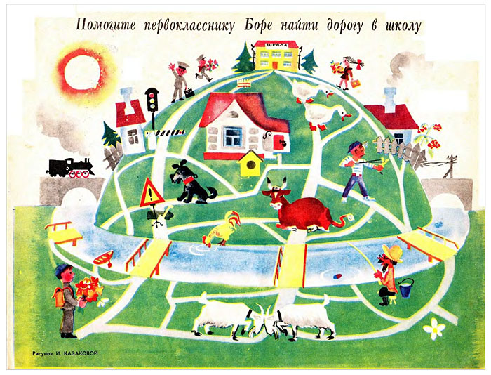 Помогите первокласснику Боре найти дорогу в школу.